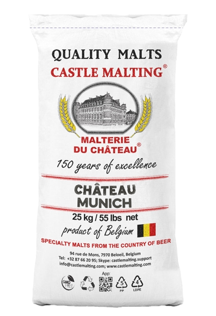 Солод насиченого золотого кольору. Злегка підвищує кольоровість пива, надаючи йому золотисто-помаранчевий відтінок. Більшості сортів пива надає яскраво виражений аромат зерна і солоду, не впливаючи при цьому на стійкість піни або на міцність. У невеликих кількостях в поєднанні з солодом Château Pilsen 2RS солод Château Munich використовується у виробництві світлих сортів пива для отримання більш тонкого букету і більш насиченого кольору. Підсилює смак пива «з характером».